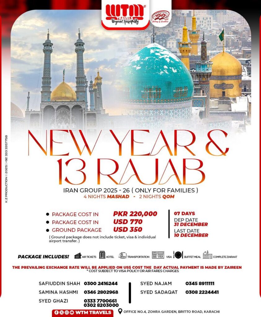WTM TRAVELS is thrilled to announce its 13 RAJAB & NEW YEAR IN IRAN . Led by and Aalim e Deen, and Noha Khuwan. This journey promise spiritual guidance. Join us for an unforgettable journey where every detail is carefully curated for your enjoyment and enlightenment.
