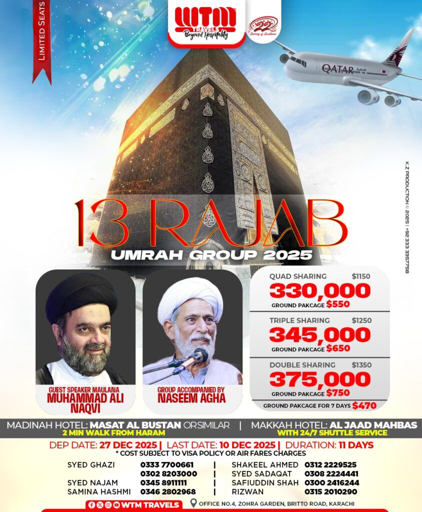 WTM TRAVELS is thrilled to announce its 13 RAJAB UMRAH. Led by Aalim e Deen MOULANA NASEEM AGHA and Guest Speaker MOULANA MUHAMMAD ALI NAQVI, this journey promise spiritual guidance. Join us for an unforgettable journey where every detail is carefully curated for your comfort.