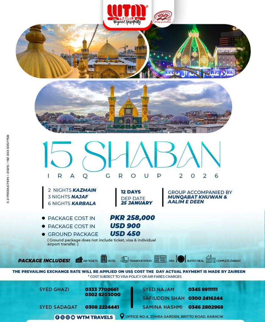 WTM TRAVELS is thrilled to announce its 15 SHABAN IRAQ GROUP 2025. Led by Aalim e Deen and Noha Khuwan, this journey promise spiritual guidance. Join us for an unforgettable journey where every detail is carefully curated for your enjoyment and enlightenment.