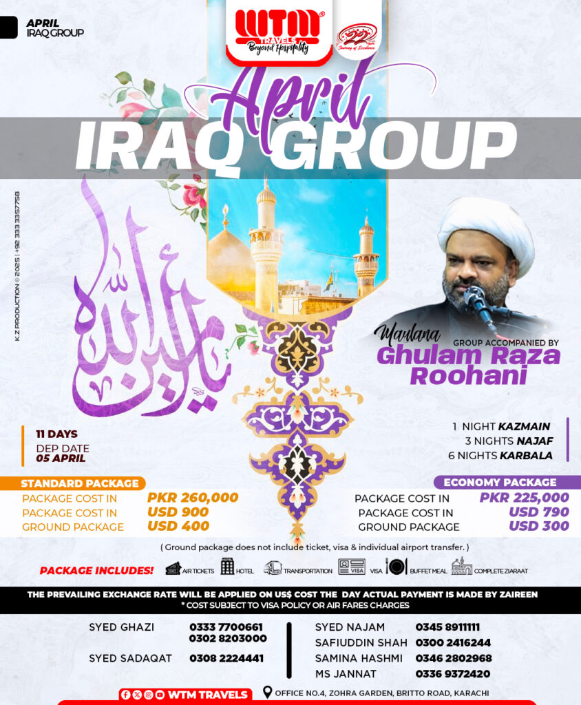 WTM TRAVELS is thrilled to announce its APRIL IRAQ GROUP 2025 . Led by MAULANA GHULAM RAZA ROOHANI. This journey promise spiritual guidance. Join us for an unforgettable journey where every detail is carefully curated for your enjoyment and enlightenment.