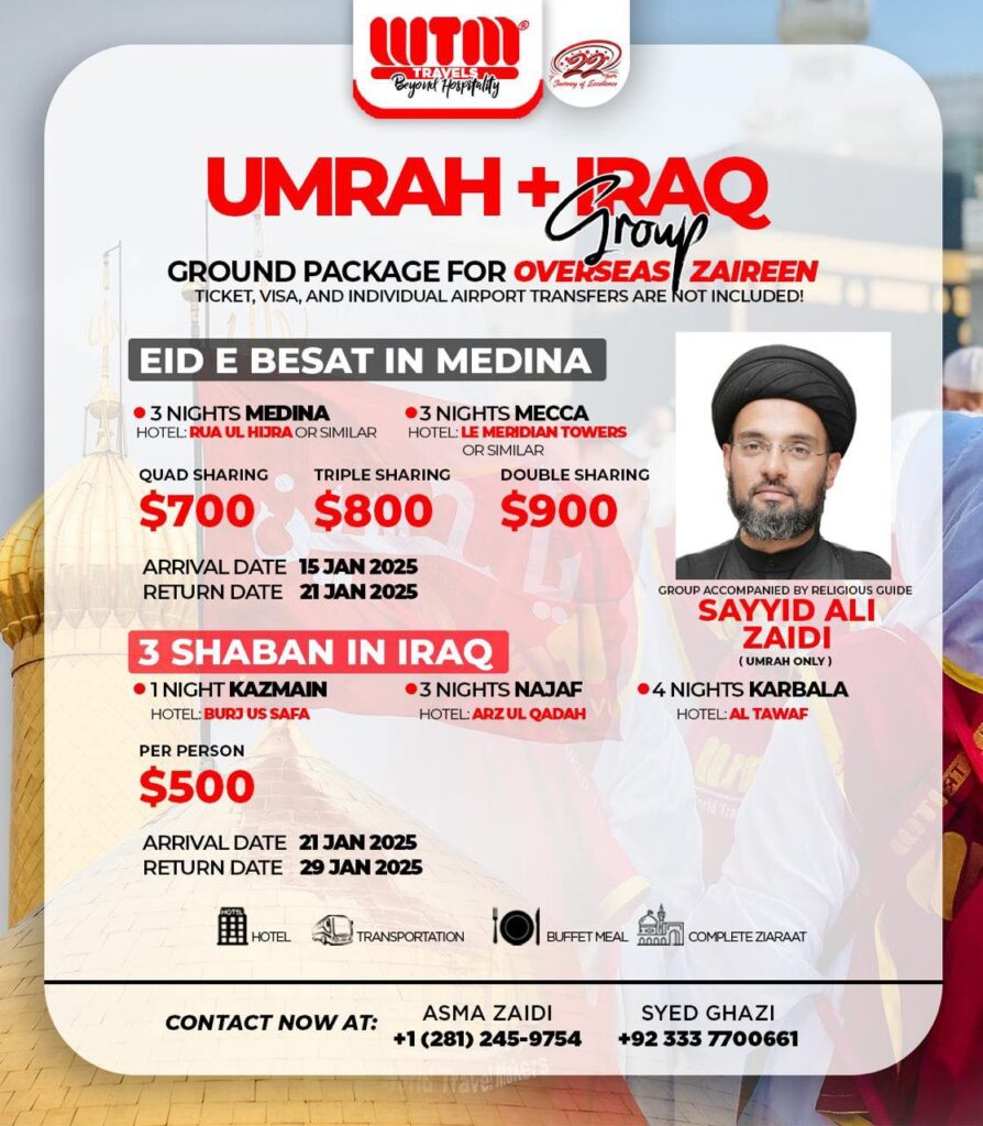 WTM TRAVELS is thrilled to announce its UMRAH + IRAQ GROUP. Led by Aalim e Deen, Mulana SAYYID ALI ZAIDI , this journey promise spiritual guidance. Join us for an unforgettable journey where every detail is carefully curated for your enjoyment and enlightenment.