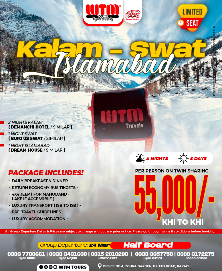 WTM TRAVELS is excited to announce its upcoming Kalam – Swat – Islamabad trip! Get ready for an unforgettable experience filled with breathtaking landscapes, peaceful valleys, and vibrant city views.