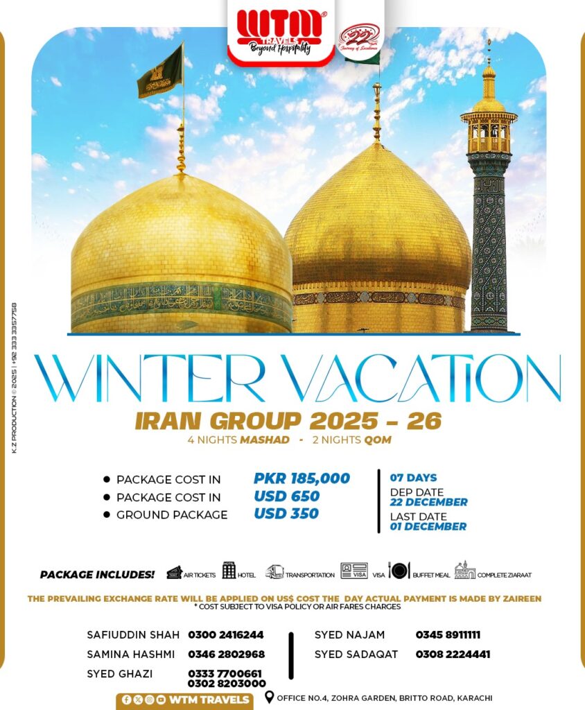 WTM TRAVELS is thrilled to announce its WINTER VACAION IN IRAN . Led by Aalim e Deen and Noha Khuwan.This journey promise spiritual guidance. Join us for an unforgettable journey where every detail is carefully curated for your enjoyment and enlightenment.