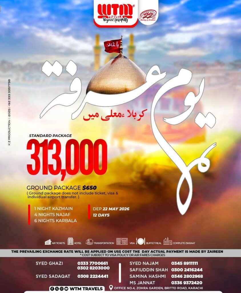 WTM TRAVELS is thrilled to announce its YOUM E ARFAH IN KARBALA. Lead by Noha Khuwan, and Alim e Deen, this journey promise spiritual guidance. Join us for an unforgettable journey where every detail is carefully curated for your enjoyment and enlightenment.